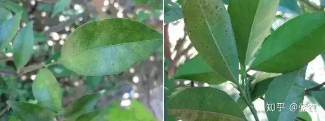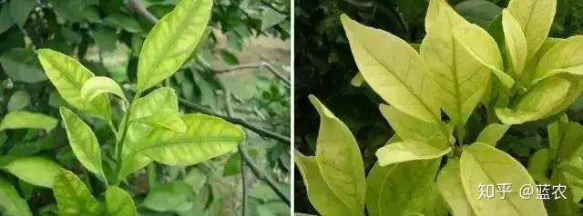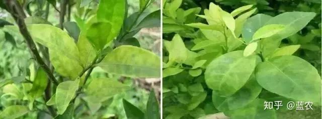 左:紅鼻子果 右:?青頭果2、班駁狀黃化葉:是田間判斷柑桔黃龍病的次要癥狀之一,次要從葉片的基部和邊沿起頭發(fā)黃,葉片班駁型:即葉片成熟轉(zhuǎn)綠后,呈現(xiàn)黃綠相間、不合錯誤稱的班駁黃化,一般呈現(xiàn)在昔時生的已老熟春梢和夏梢葉片上;柑橘黃龍病引起的葉片黃化癥狀,與缺氮、缺鋅或缺錳等引起的葉片黃化差別。心理病害一般是從樹冠下部起頭發(fā)作,然后向上蔓延,病葉柔嫩,不會變硬,后期也沒有班駁癥狀。加強水肥辦理后,癥狀就會逐步消退。柑橘黃龍病引起的葉片黃化是從少數(shù)黃梢逐步擴展到全株,在葉片上引起黃綠相間的班駁型,葉片變細頰長,量地較硬,并顯示明顯的傳染性。