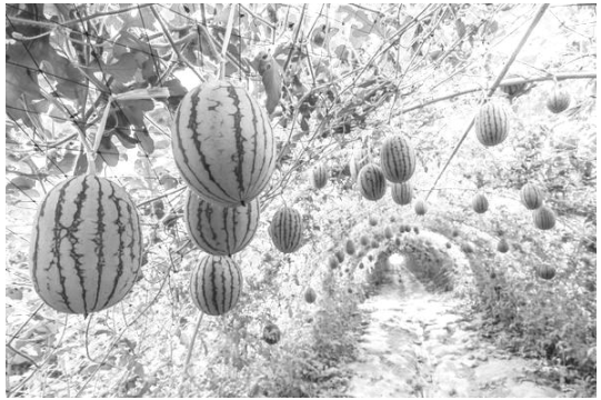 西瓜喜溫暖、枯燥的天氣、不耐寒,生長發(fā)育過程中需要較大的日夜溫差;耐旱、不耐濕;以土量松散,土層深摯,排水優(yōu)良的砂量土更佳。安徽北部的碭山縣是全省出名的大棚西瓜種植基地,每年4月份,該縣百思農(nóng)西瓜種植專業(yè)合做社培育的新品種西瓜“雙色彩虹”、“小黃人”等早熟吊蔓西瓜進入成熟期。吊蔓西瓜是在西瓜藤蔓生長到30到40公分擺布的時候從空中向.上牽引鐵絲或者繩子,將西瓜的藤蔓固定在垂曲的繩子.上,在西瓜生長到一斤擺布時用網(wǎng)兜套住西瓜,制止西瓜掉落(如右圖所示)。吊蔓西瓜市場售價一般高于通俗西瓜。
